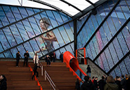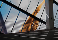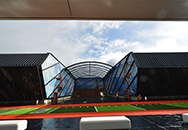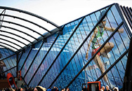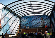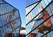 Approximately 8,000 square feet of decorative laminated glass comprise the the exterior walls of this world headquarters corporate garage. Digitally printed photographs of world-class Olympic athletes in huge scale reinforces the company's mission.