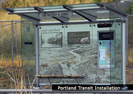 At present, Moon Shadow Etchers' exciting new project is creating beautiful panels for Portland Transit. The project is for a street car stop. Moon Shadow Etchers is etching 18 panels of glass for 6 stops of 19th Century vintage, nostalgic images of the area, including historical textual excerpts. This is Moon Shadow Etchers second street car project; and transit authorities across the country are now expressing interest.