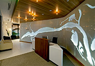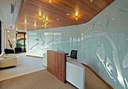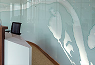 This unique project consists of floor-to-ceiling glass panels -- including a curved area -- that form a wall. The map of the Columbia River, which meanders across the wall, utilizes etched areas of differing depths to reflect the actual topographic character of the river. Selected areas of the etched design are paint filled on the back to enhance readability.